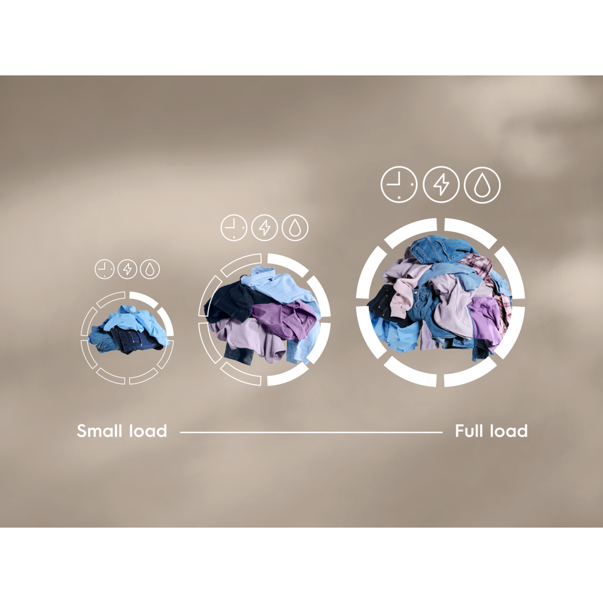 Sensorit säätävät ohjelmaa automaattisesti pyykkimäärän mukaan, mikä vähentää käytettyä aikaa, energiaa ja vettä.Tämä tarkoittaa, että edes pienintä pyykkimäärää ei pestä liian pitkään, jolloin vaatteet säilyttävät ulkonäkönsä ja tuntumansa.