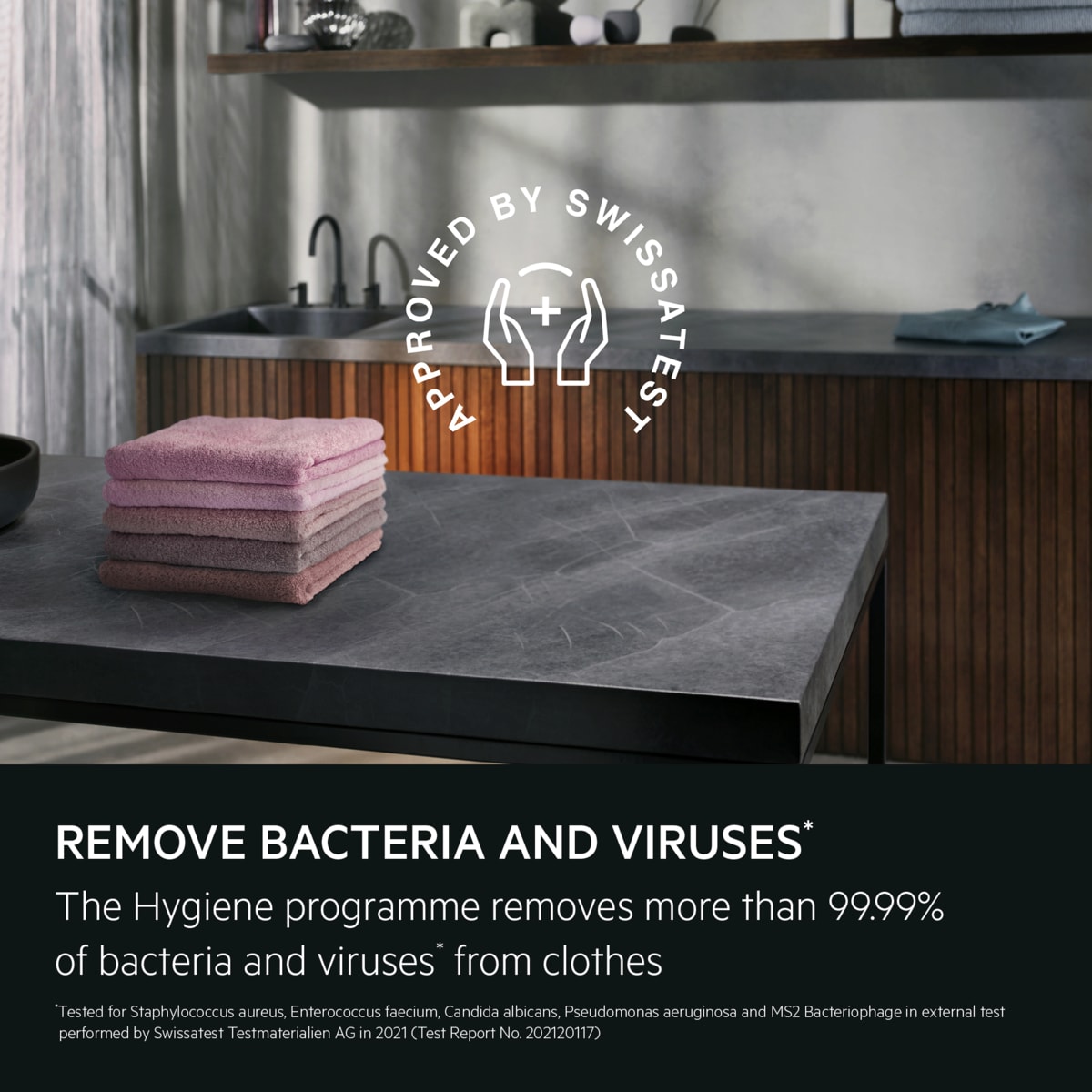 *Testattu Staphylococcus aureus, Enterococcus faecium, Candida albicans, Pseudomonas aeruginosa ja MS2-bakteriofagi ulkoisessa testissä, jonka suoritti Swissatest Testmaterialien AG 2021 (testiraportti nro. 202120117)